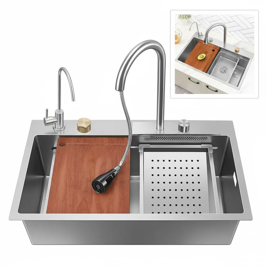 Estación de Trabajo Multifunción: Incluye accesorios modulares (tablas, cestas y coladores) que se deslizan sobre la bacha, permitiéndote picar, lavar y escurrir en un solo lugar.