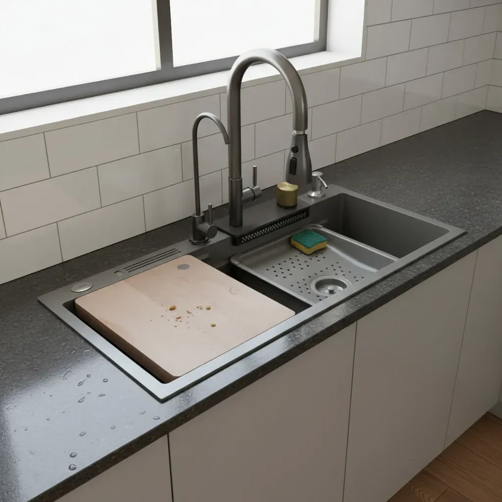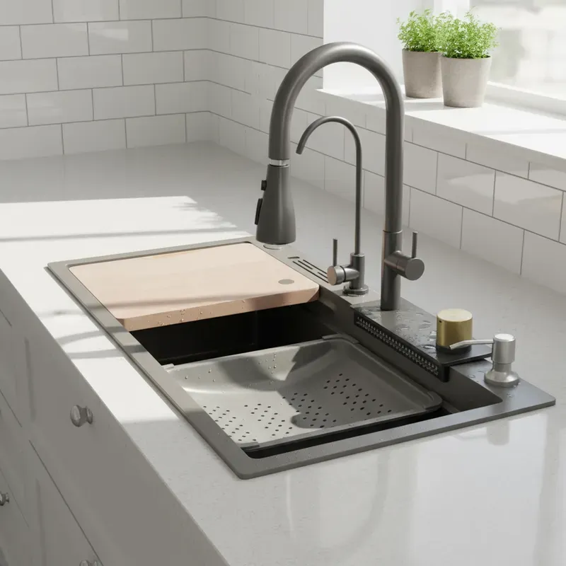 ¡Transformá tu cocina en un espacio de diseño profesional y eficiencia total! Esta bacha inteligente en color Gris Titanio no es solo un fregadero, es una estación de trabajo completa. Diseñada para quienes buscan lo último en tecnología y estética, combina una bacha de gran capacidad con funciones de lavado avanzadas que optimizan cada tarea, desde lavar vegetales hasta limpiar ollas de gran tamaño.