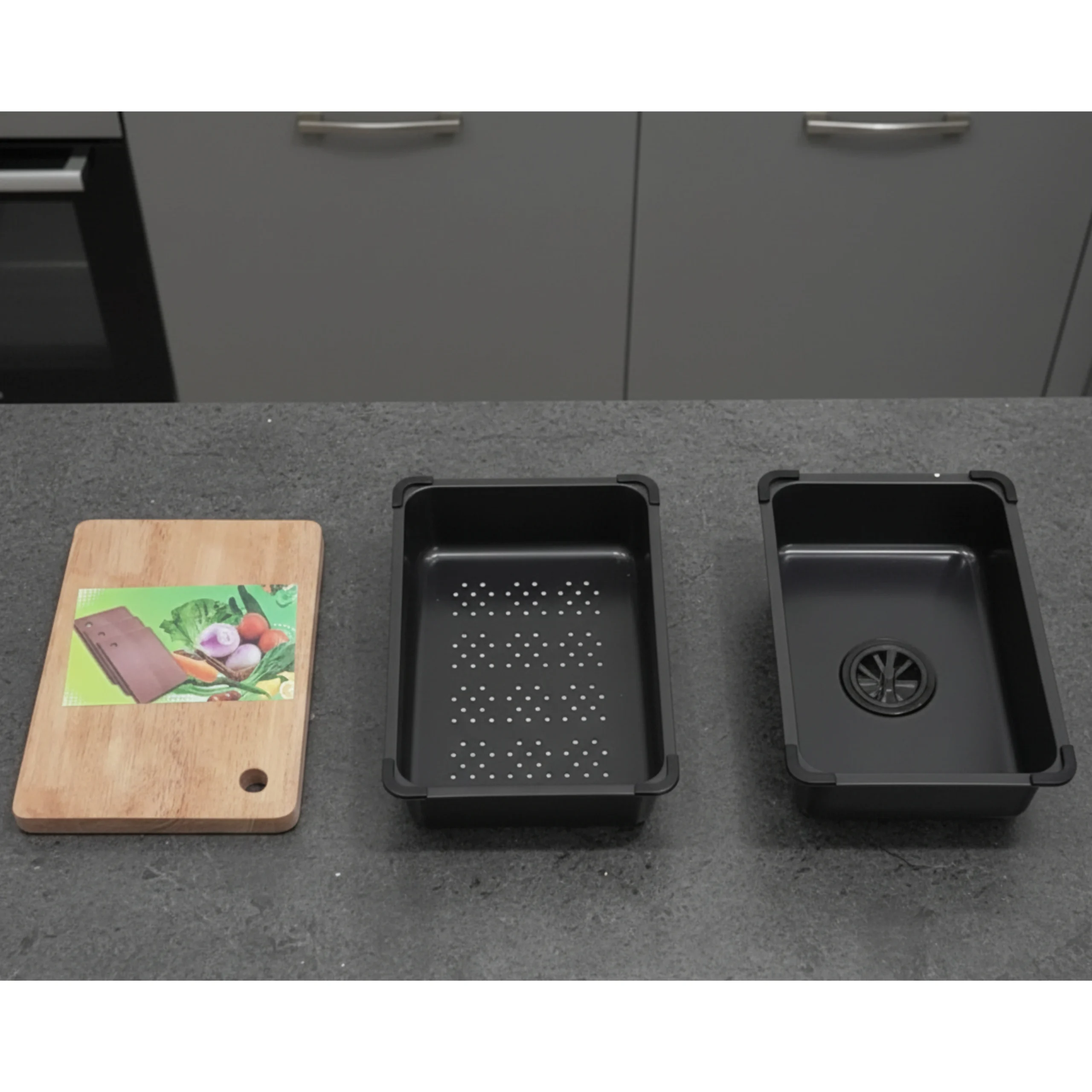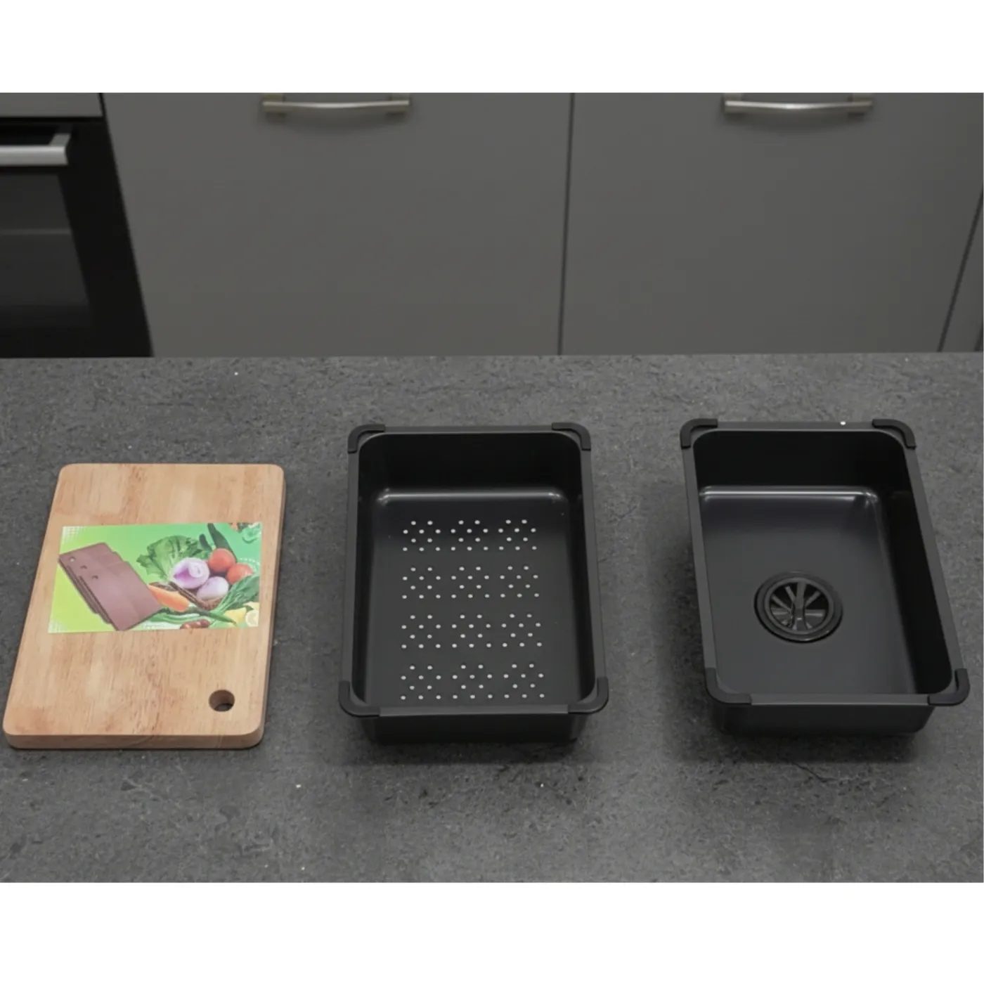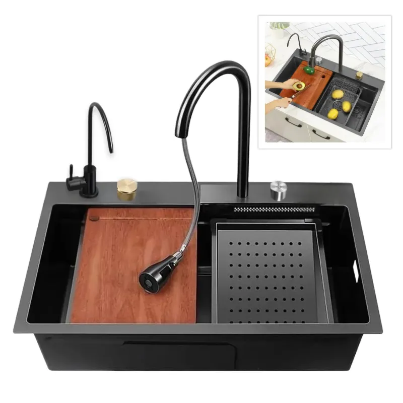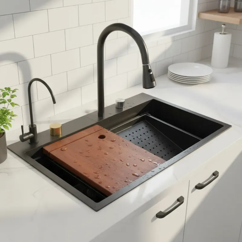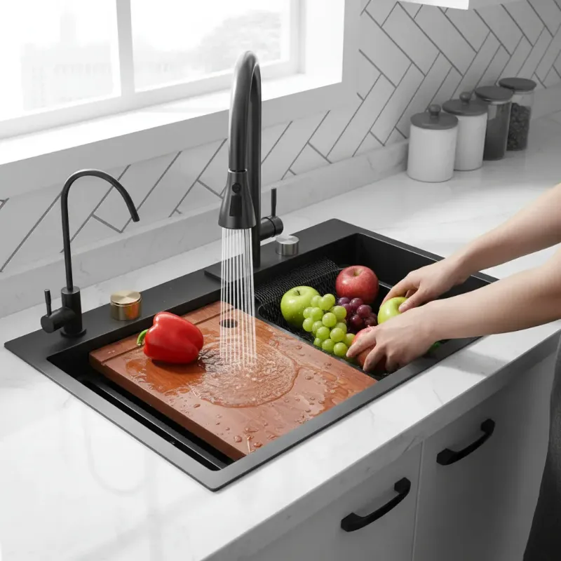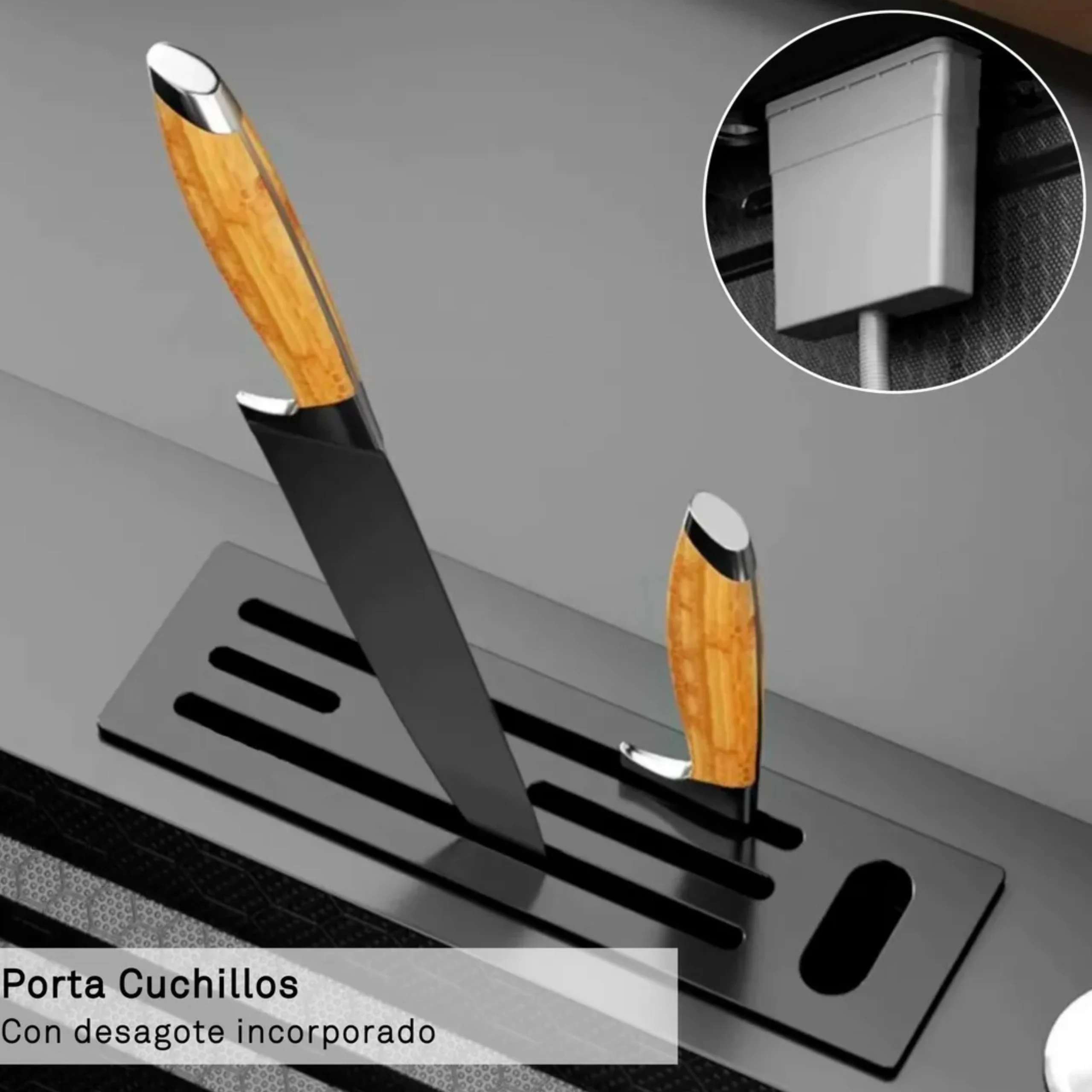 Accesorios Full Incluidos: Grifería extraíble 360°, tabla de picar de madera curada, coladores de acero y kit de drenaje de alta velocidad.