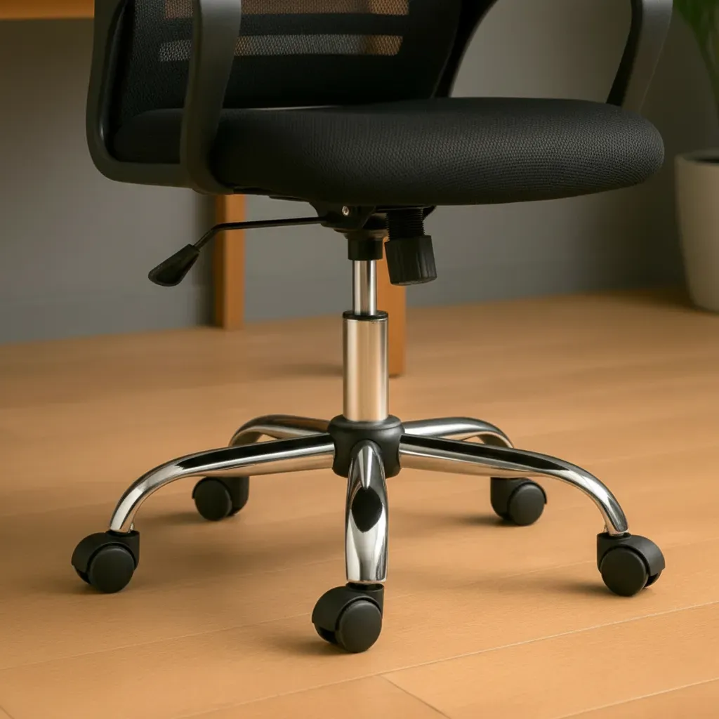 Base Estrella Reforzada y Ruedas Silent-Glide: Estructura de alta estabilidad con ruedas de giro 360° que se deslizan suavemente sobre cualquier superficie (piso flotante, cerámica o alfombra) sin rayarlas.